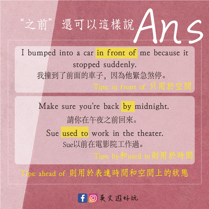 ahead of可用於表達時間和空間上的狀態,in front of 只用於空間 by和used to則用於時間