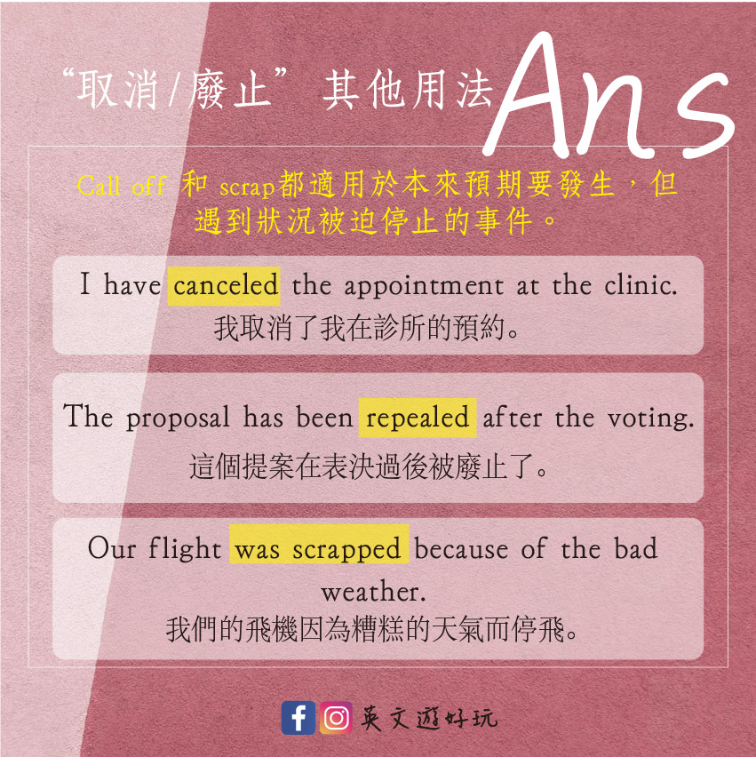 當要用英文表達活動或是事件取消甚至是廢止的時候,有很多種狀況,一起來看看底下例句,學會最基本的說法喔!