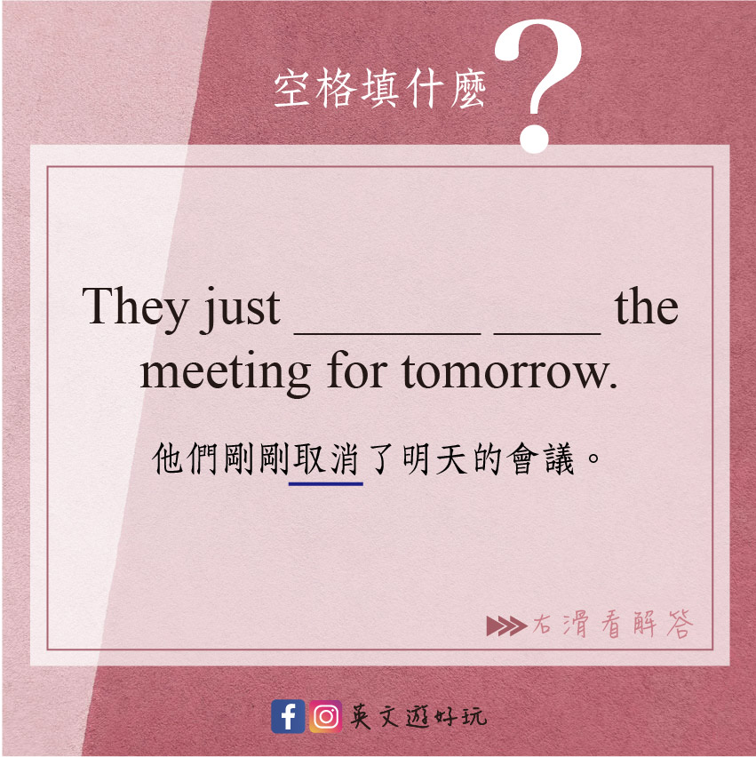 - They just called off the meeting for tomorrow. 他們剛剛取消了明天的會議。