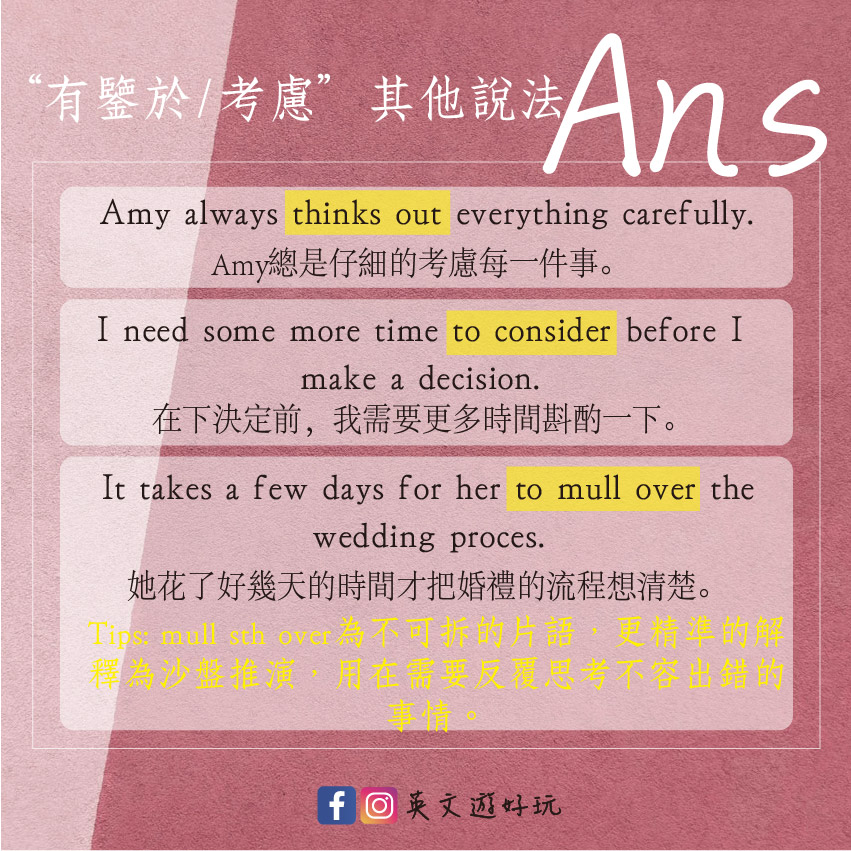 做一件事當有依據的根據或是根據一些事實正在考慮,就會使用到「有鑒於、考慮」的說法,這時要怎麼用英文表達呢?繼續往下看!
