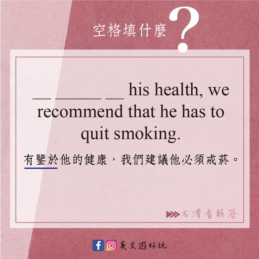 - In view of his health, we recommend that he has to quit smoking. 有鑒於他的健康,我們建議他必須戒菸。