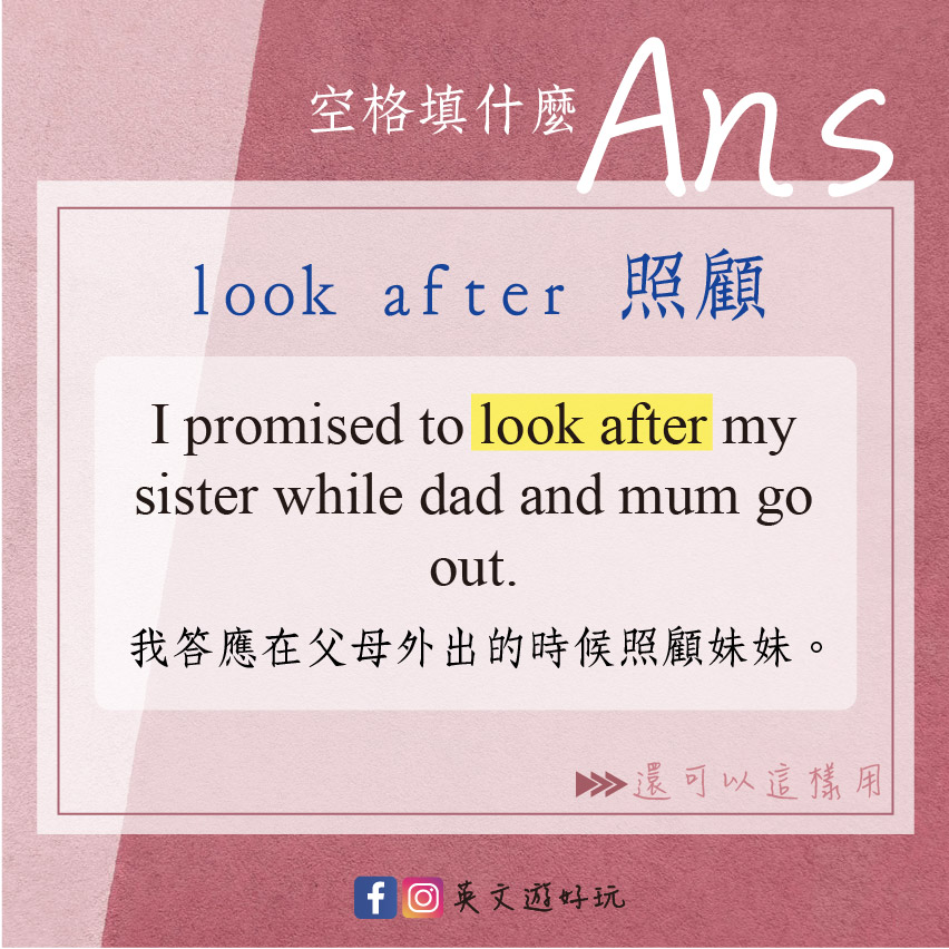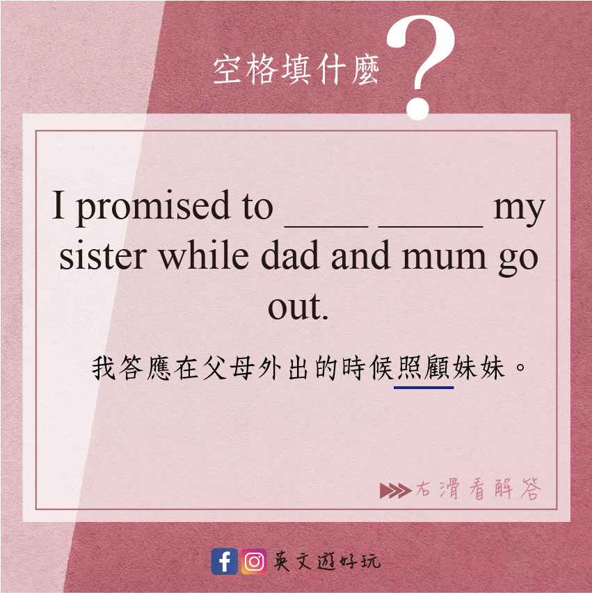- I promised to look after my sister while dad and mum go out. 我答應在父母外出的時候照顧妹妹。