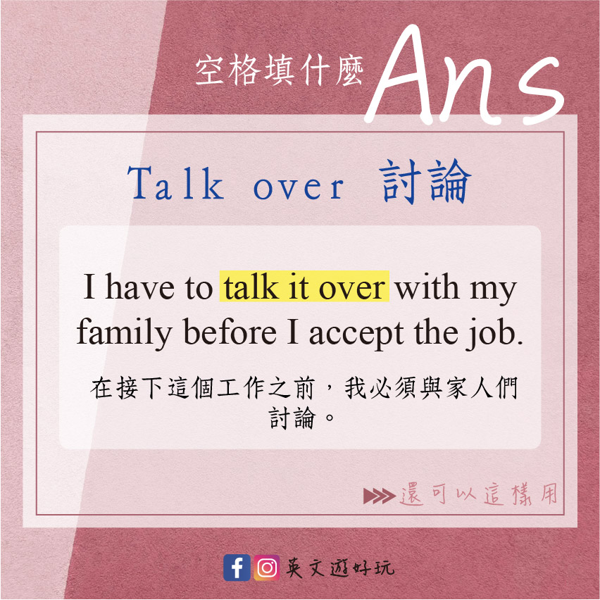 - I have to talk it over with my family before I accept the job.在接下這個工作之前,我必須與家人們討論。