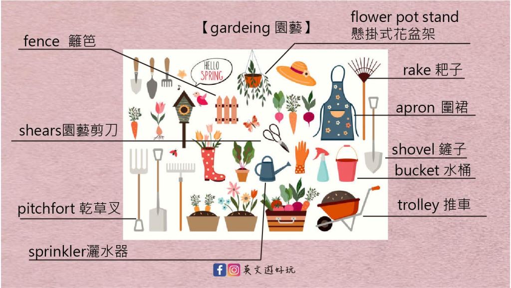 關於園藝裡的各種大小工具,這些英文單字該怎麼說呢?學起來以後有機會當媽媽的小幫手喔!