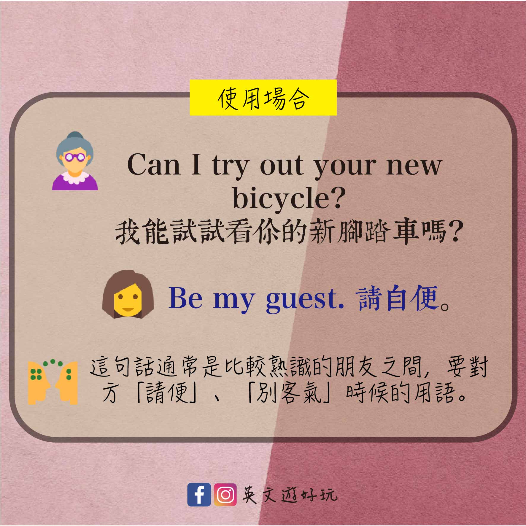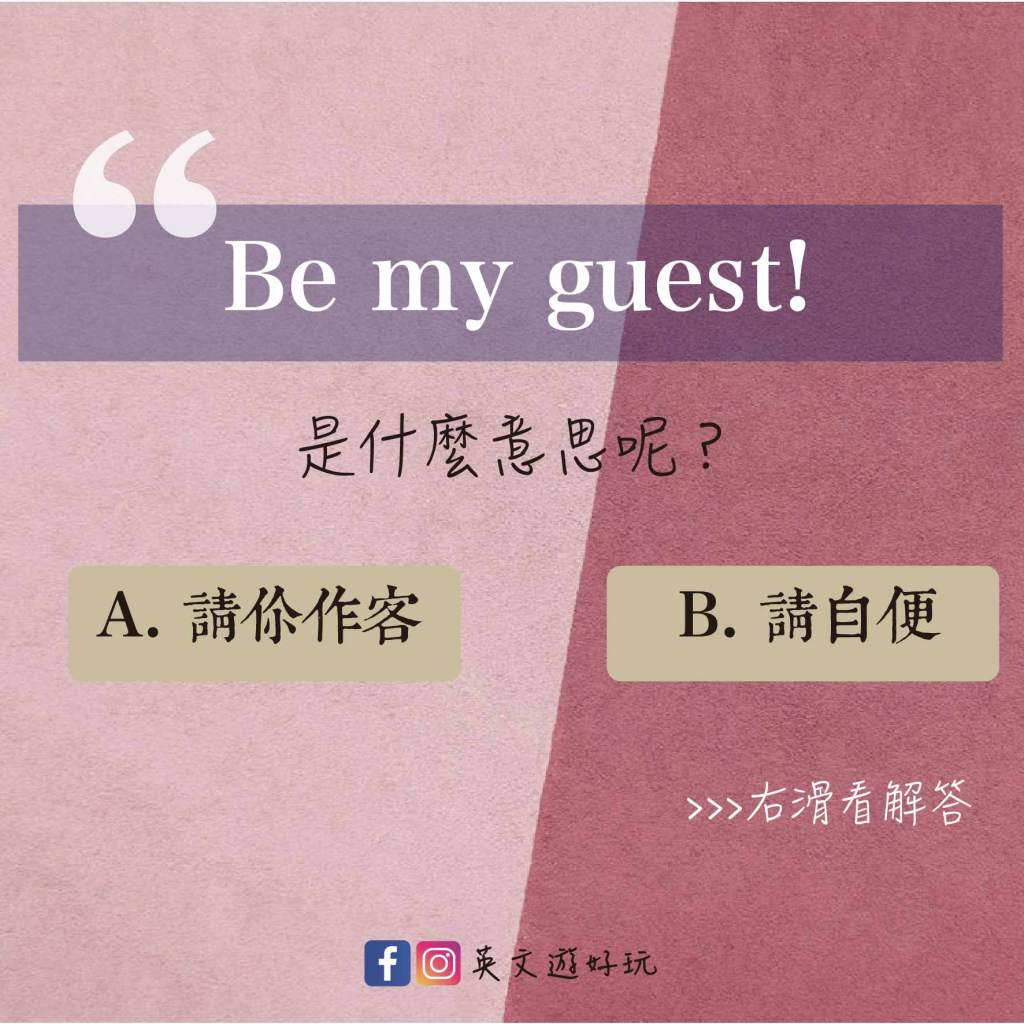 【Be my guest】是什麼意思呢? Christine Hsu2021-11-162022-02-03實用短句 文章分頁導航 上一個下一步 Be my guest. 請自便。 📌這句話通常是比較熟識的朋友之間,要對方「請便」、「別客氣」時候的用語。 上班族口說練習諮詢 分享此文: 按一下即可分享至 X(在新視窗中開啟) X 按一下以分享至 Facebook(在新視窗中開啟) Facebook 喜歡 正在載入... 相關