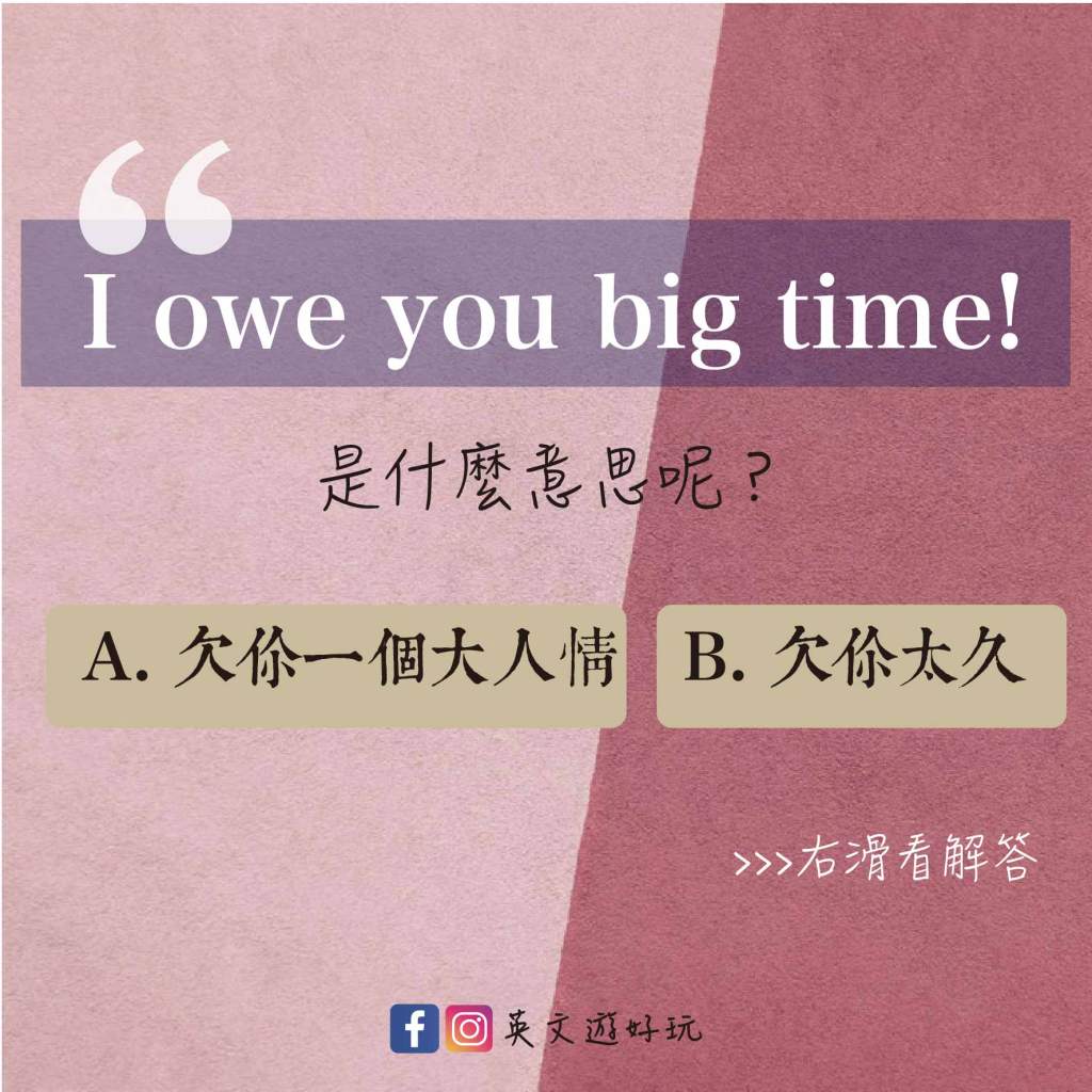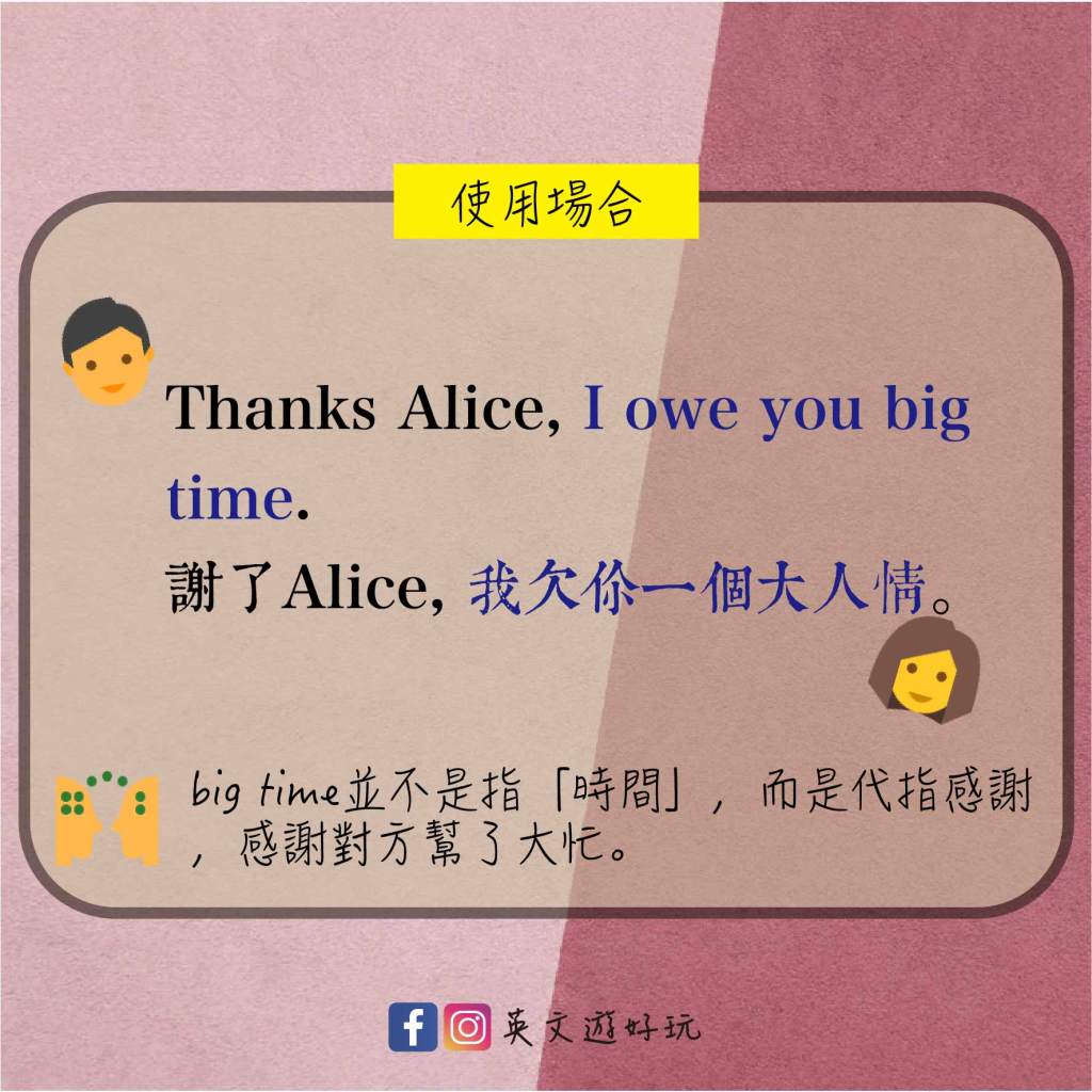 【I owe you big time】是什麼意思呢? Christine Hsu2021-11-162022-02-03實用短句 文章分頁導航 上一個下一步 I owe you big time. 欠你一個大人情。 📌big time並不是指「時間」,而是代指感謝,感謝對方幫了大忙。 上班族口說練習諮詢 分享此文: 按一下即可分享至 X(在新視窗中開啟) X 按一下以分享至 Facebook(在新視窗中開啟) Facebook 喜歡 正在載入... 相關