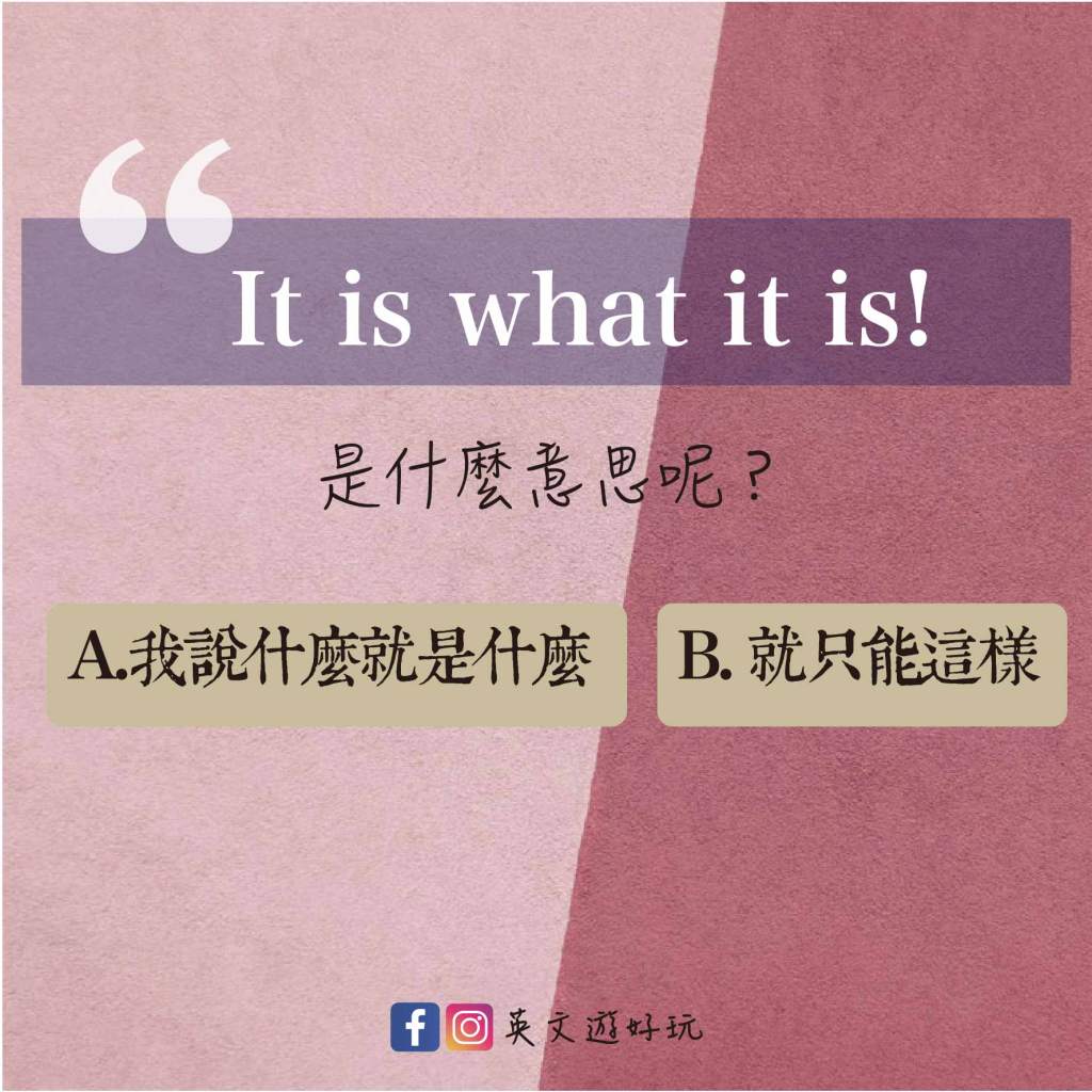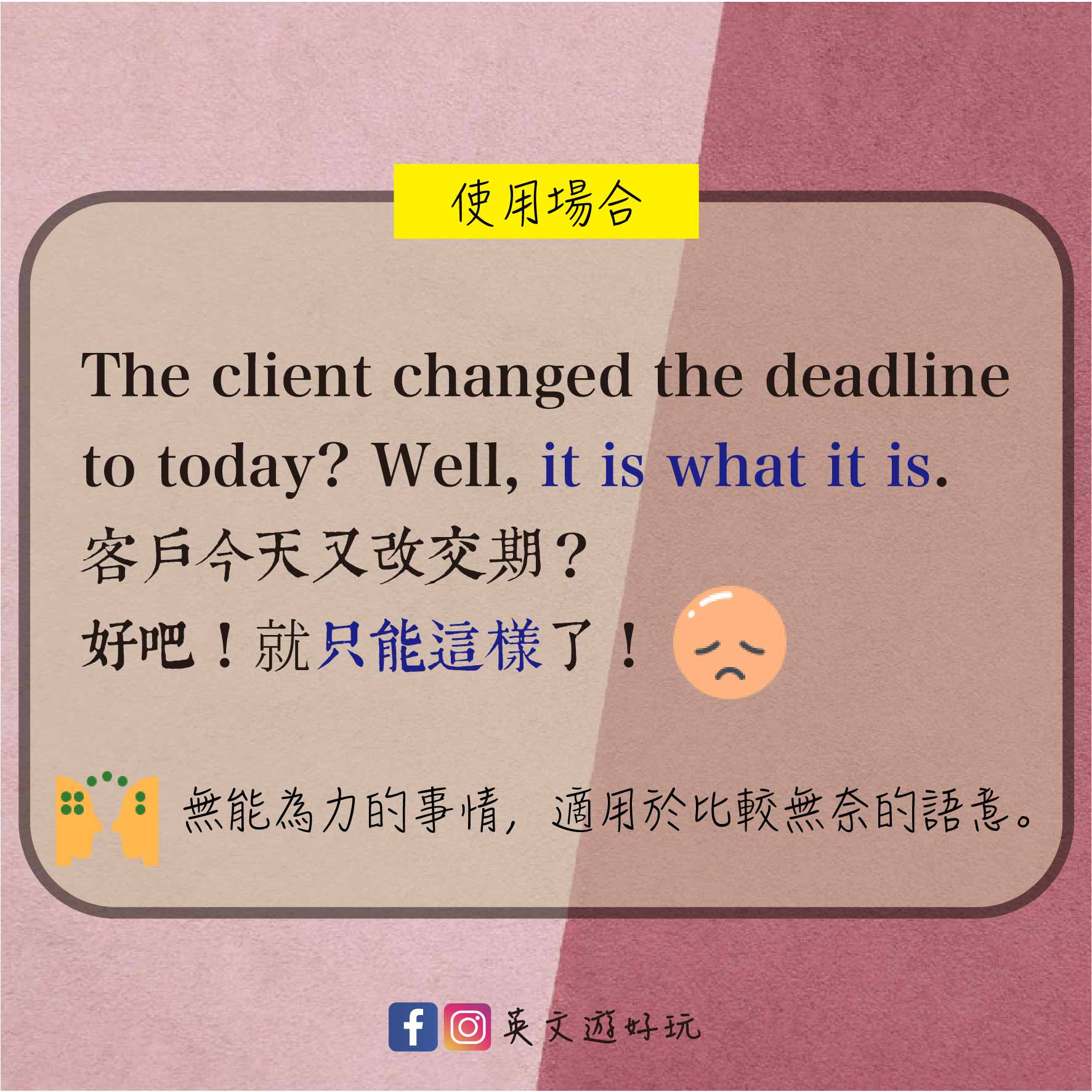 【It is what it is】是什麼意思呢? Christine Hsu2021-11-162022-02-03實用短句 文章分頁導航 上一個下一步 It is what it is 就只能這樣。 📌無能為力的事情,適用於比較無奈的語意。 上班族口說練習諮詢 分享此文: 按一下即可分享至 X(在新視窗中開啟) X 按一下以分享至 Facebook(在新視窗中開啟) Facebook 喜歡 正在載入... 相關