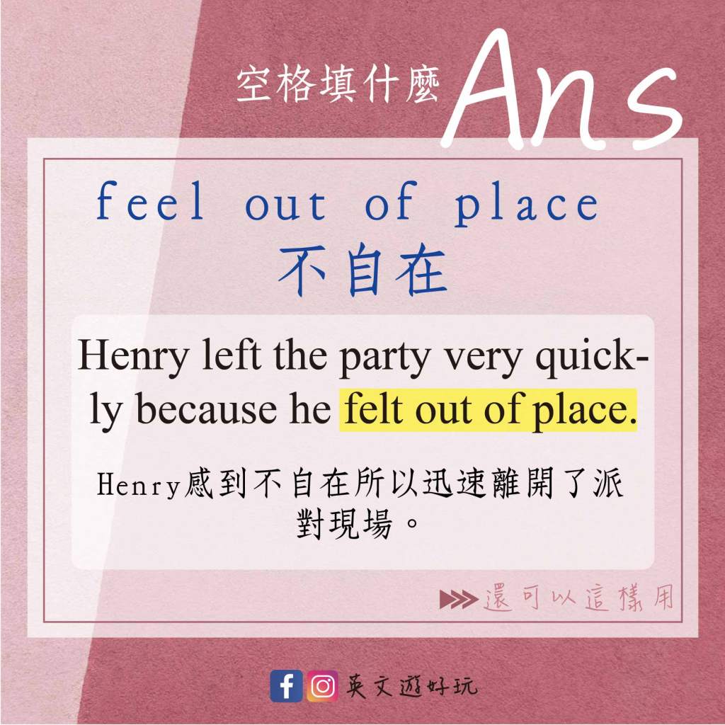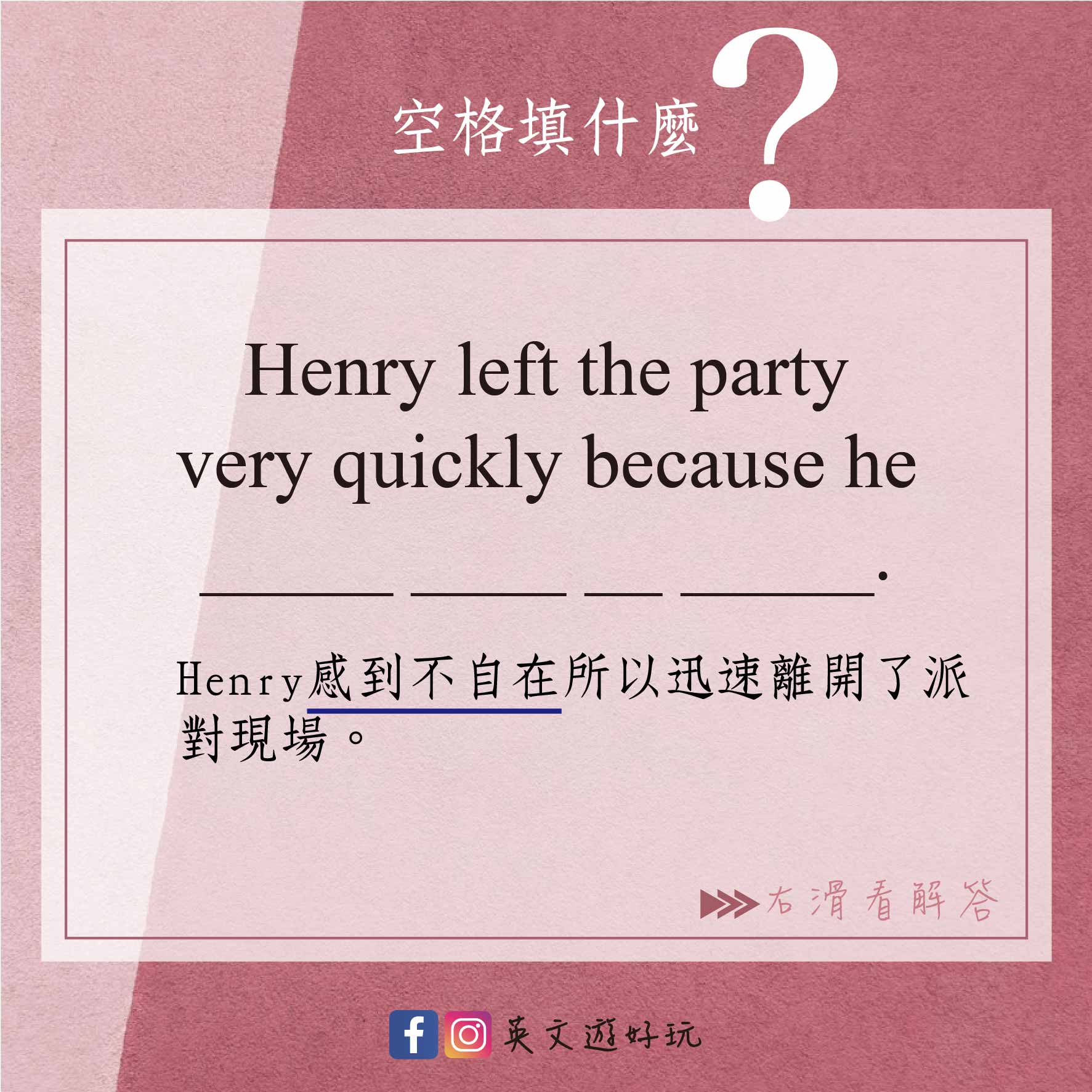 - Henry left the party very quickly because he felt out of place. Henry感到不自在所以迅速離開了派對現場。