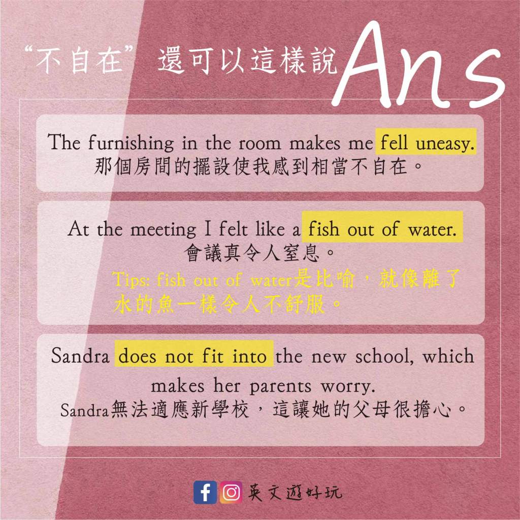 📌fish out of water是比喻,就像離了水的魚一樣令人不舒服。