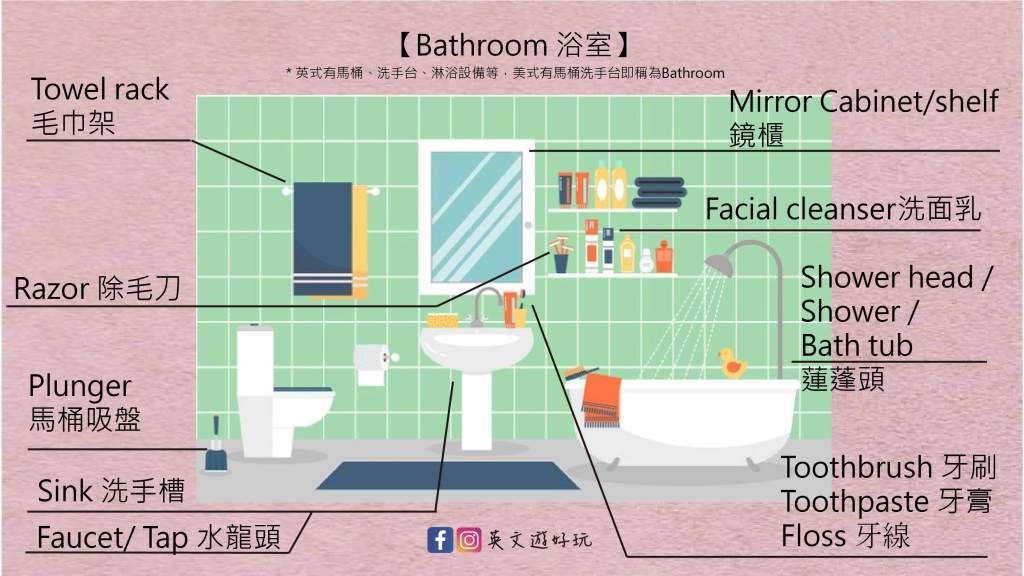 - 浴室 Bathroom 英式有馬桶、洗手台、淋浴設備等,美式有馬桶洗手台即稱為Bathroom