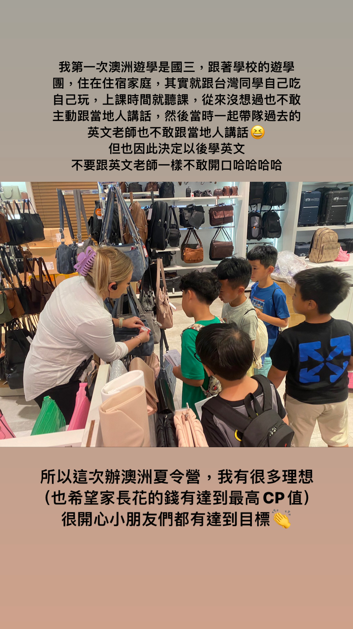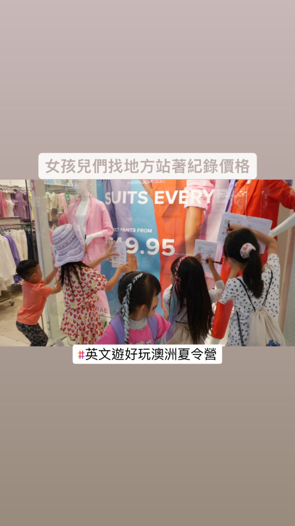 澳洲遊學行程 – 購物挑戰 Christine Hsu2025-01-082025-01-09親子遊學日誌 文章分頁導航 上一個下一步 把小朋友分組,由兩外老師帶隊前進購物中心,要在時間範圍內,完成購物挑戰,主要規則是:每一位小朋友都要開口問! 經過一輪的挑戰,孩子們的開口說英文自信都大增耶! 分享此文: 按一下即可分享至 X(在新視窗中開啟) X 按一下以分享至 Facebook(在新視窗中開啟) Facebook 喜歡 正在載入... 相關