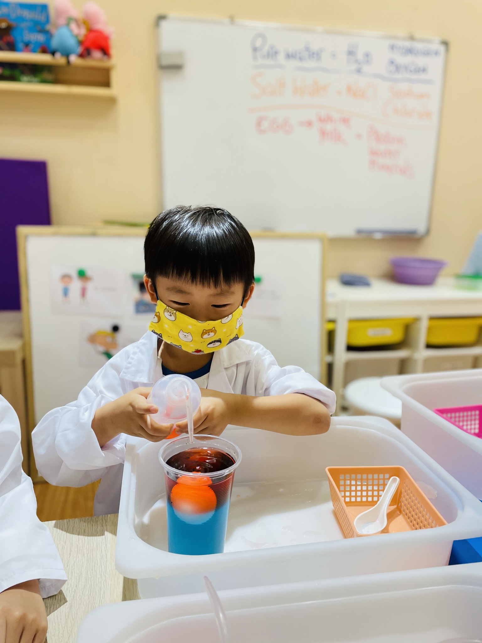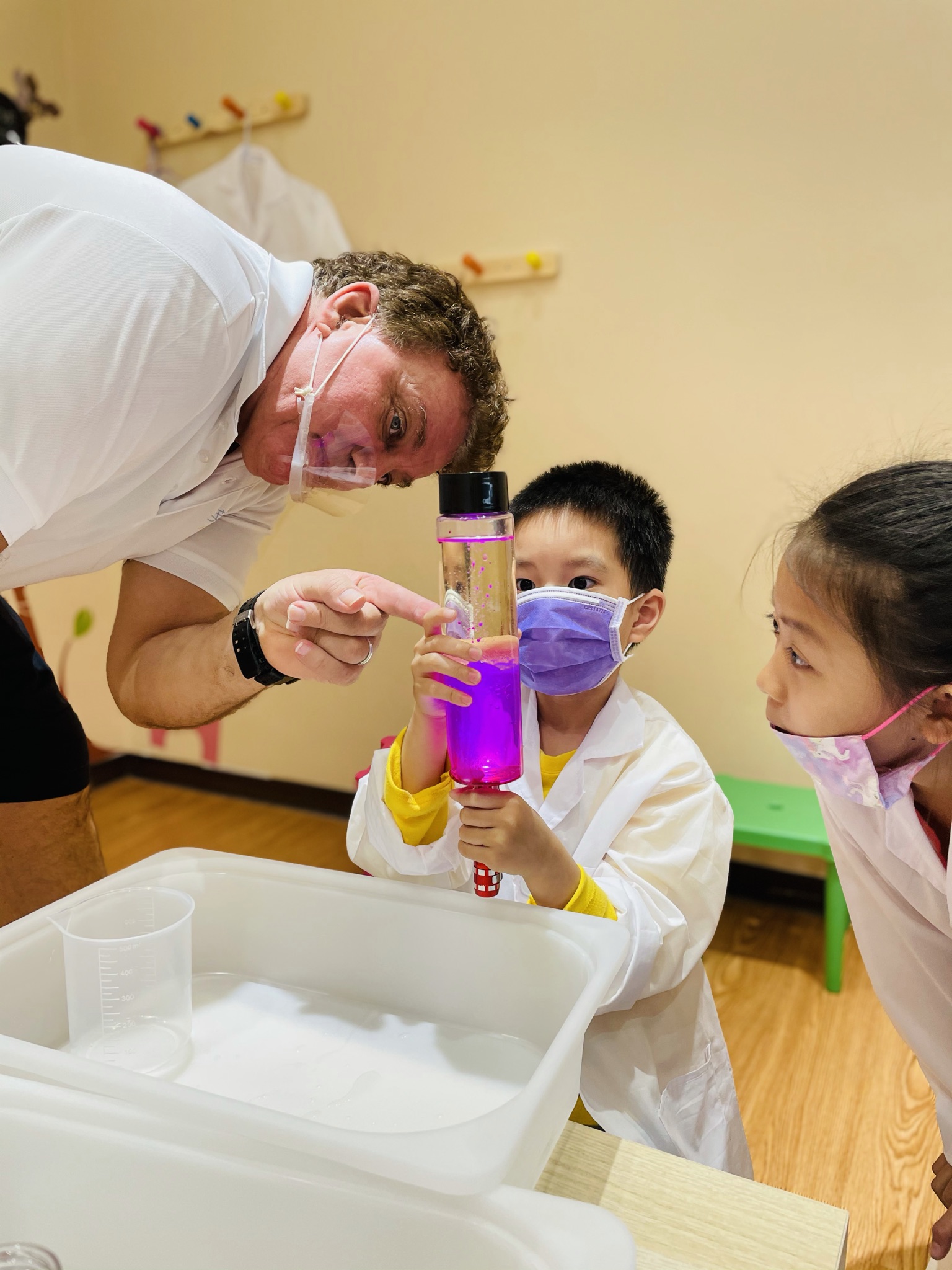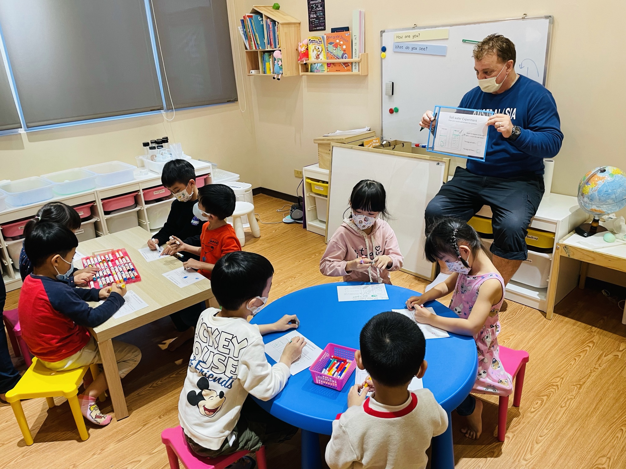 以英文繪本暖場,幫孩子打開英文耳朵,藉由全英文互動科學實作,學習使用各種素材、工具或器材。為了達到實驗效果,孩子在過程中也會特別專心呢。