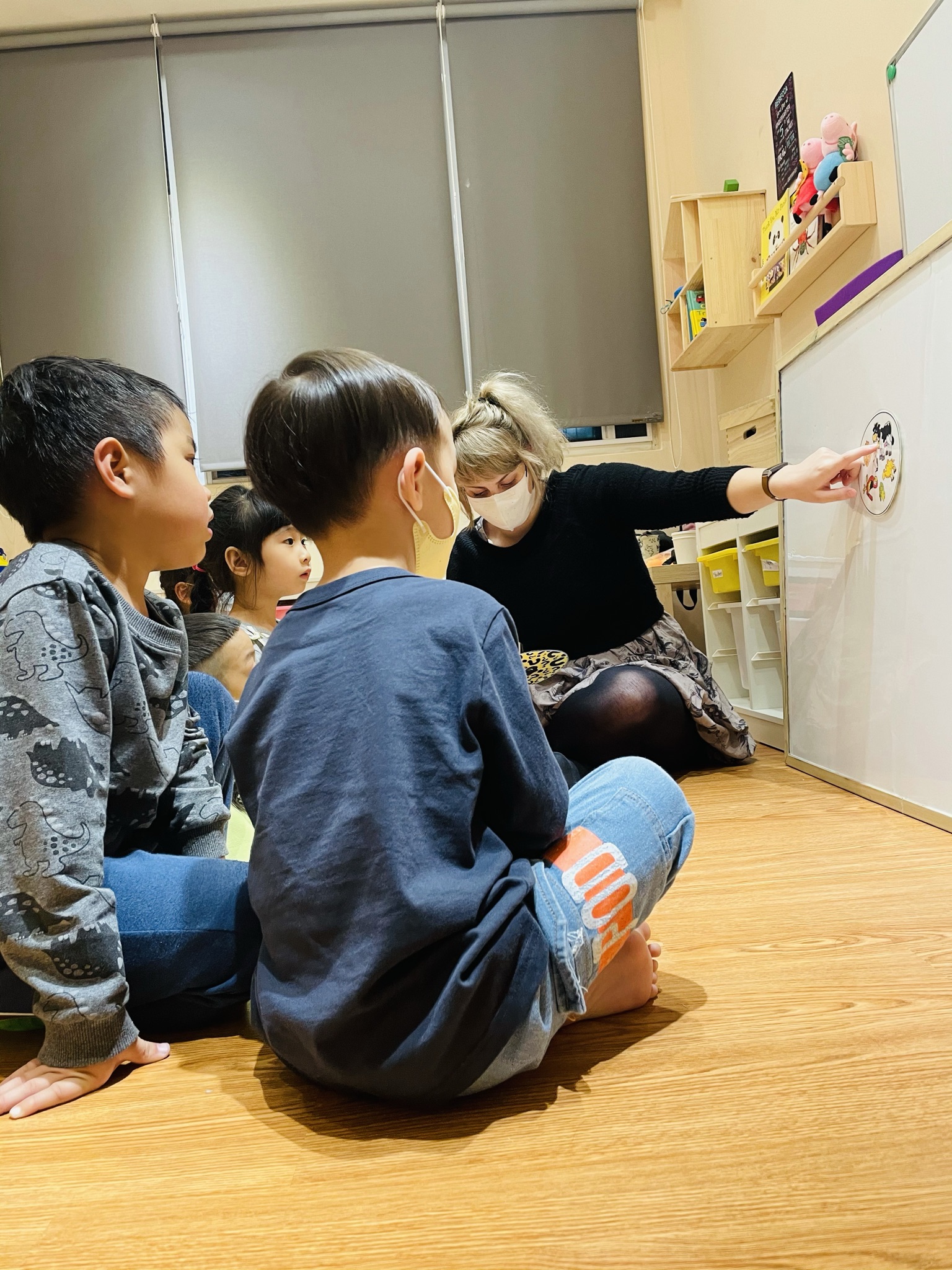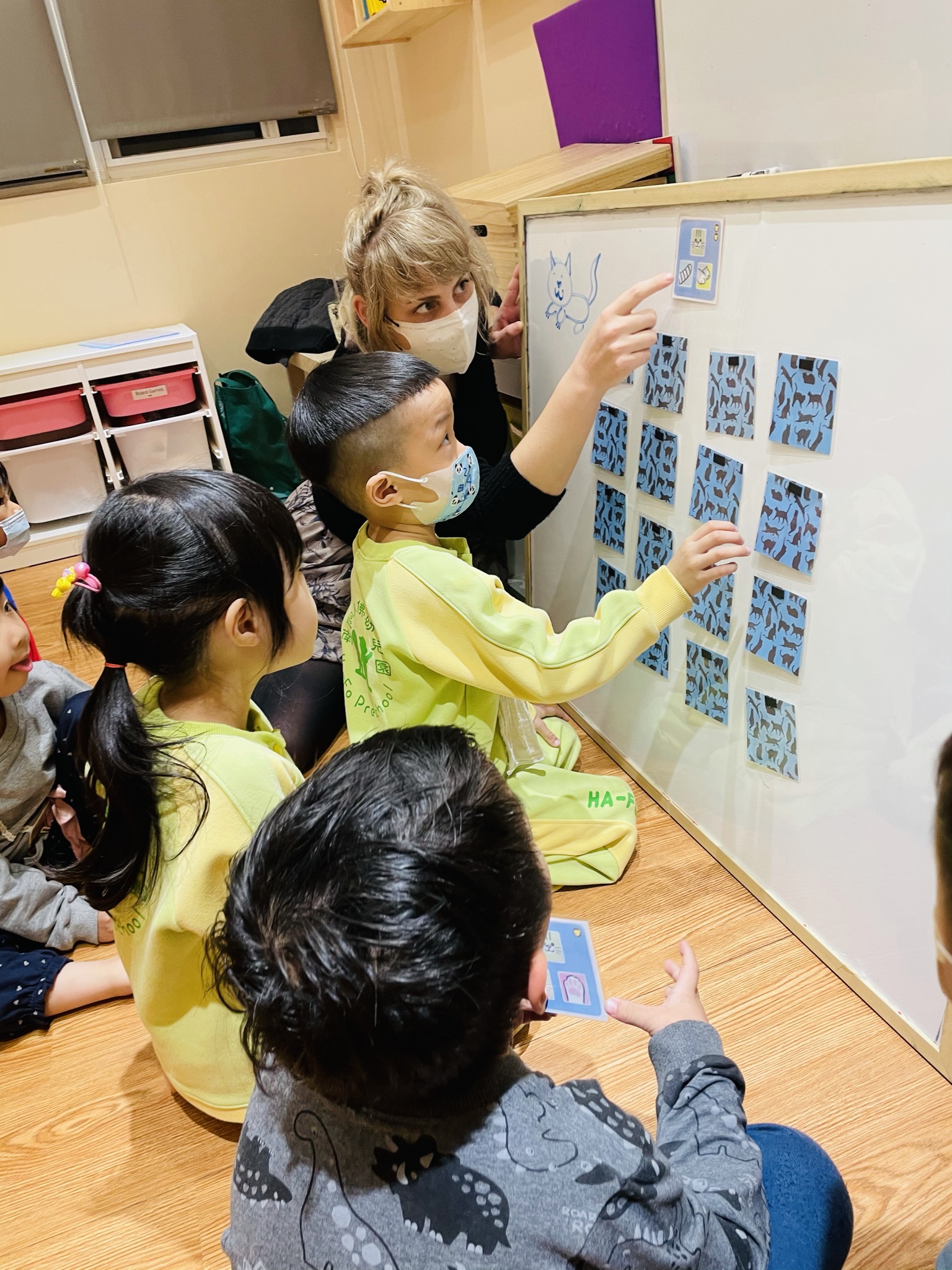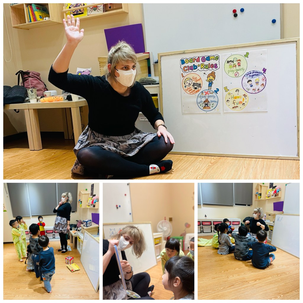老師會用英文跟大家解釋遊戲規則,過程中也會鼓勵大家用英文對答,如果孩子英文卡住,這時候會幫忙用正確英文幫孩子把句型理順,這跟我們學習母語的模式是一樣的喔。