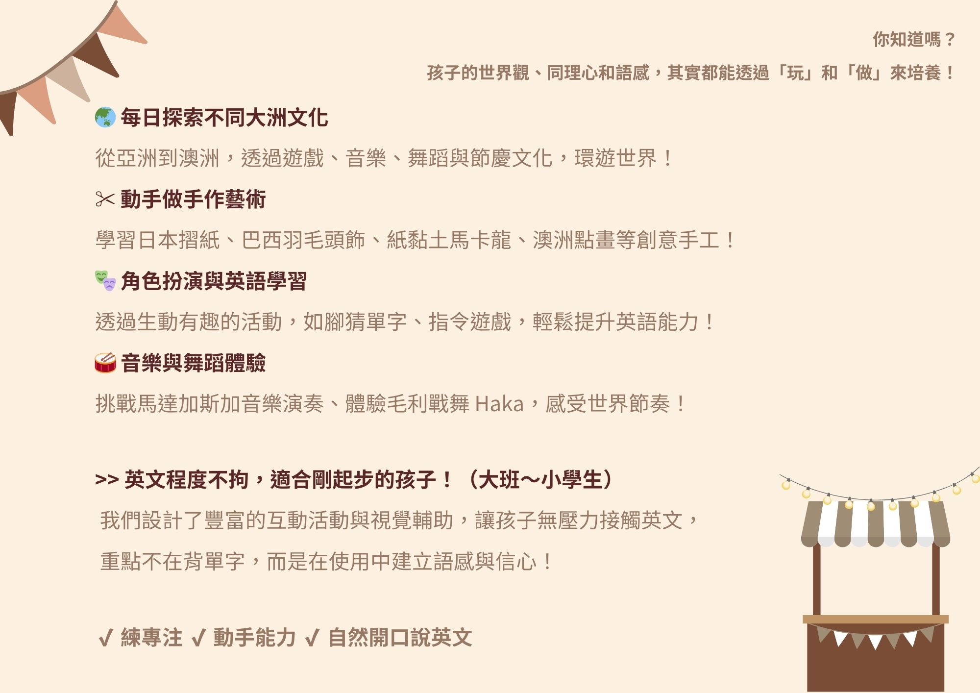 【 英文遊好玩營隊】= 好玩豐富的主題+充實的英文活動,將英文融入日常生活。無論動態與靜態的活動,都有外師一起互動,自然而然說英文!