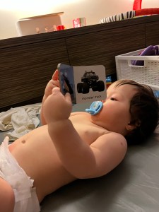 有時候一個晚上會要我們唸6、7、8、9本,有時後會自己坐著,拿起書就開始自己講故事。從他講機哩咕嚕的語氣,會看到我們講故事時語調神情的影子,很有趣。