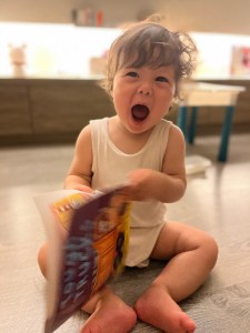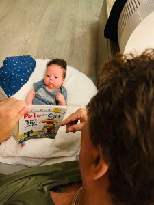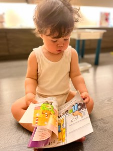 滿一歲還不會走路時,就常看到他坐著用小手拿著口袋書把玩。開始會搖搖晃晃走路時,他會拿著口袋書給我們,有時候是放了就走掉,有時候是拿給我們後,就坐下來準備要聽故事,有時候是鑽進我們懷裡一起翻著書,這樣的親子互動,讓我們覺得好溫馨感動。他喜歡膩在我們懷裡,聽我們說故事,我們也感受到親子共讀的溫馨美好。