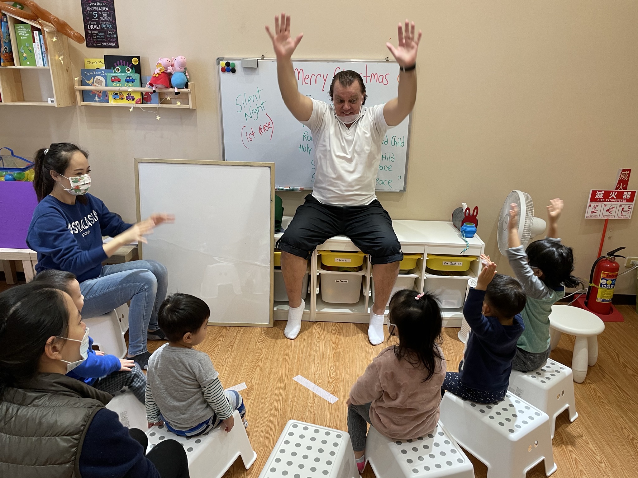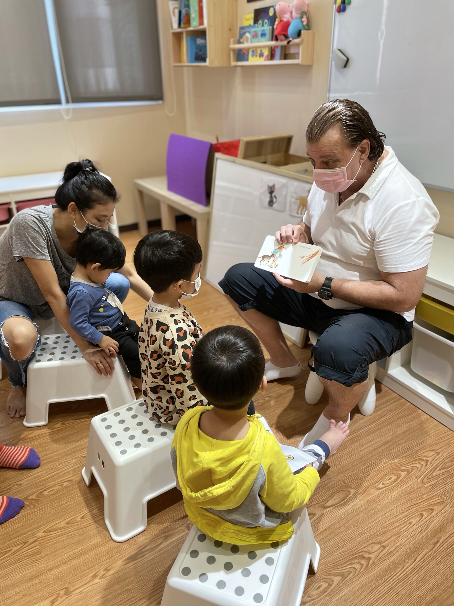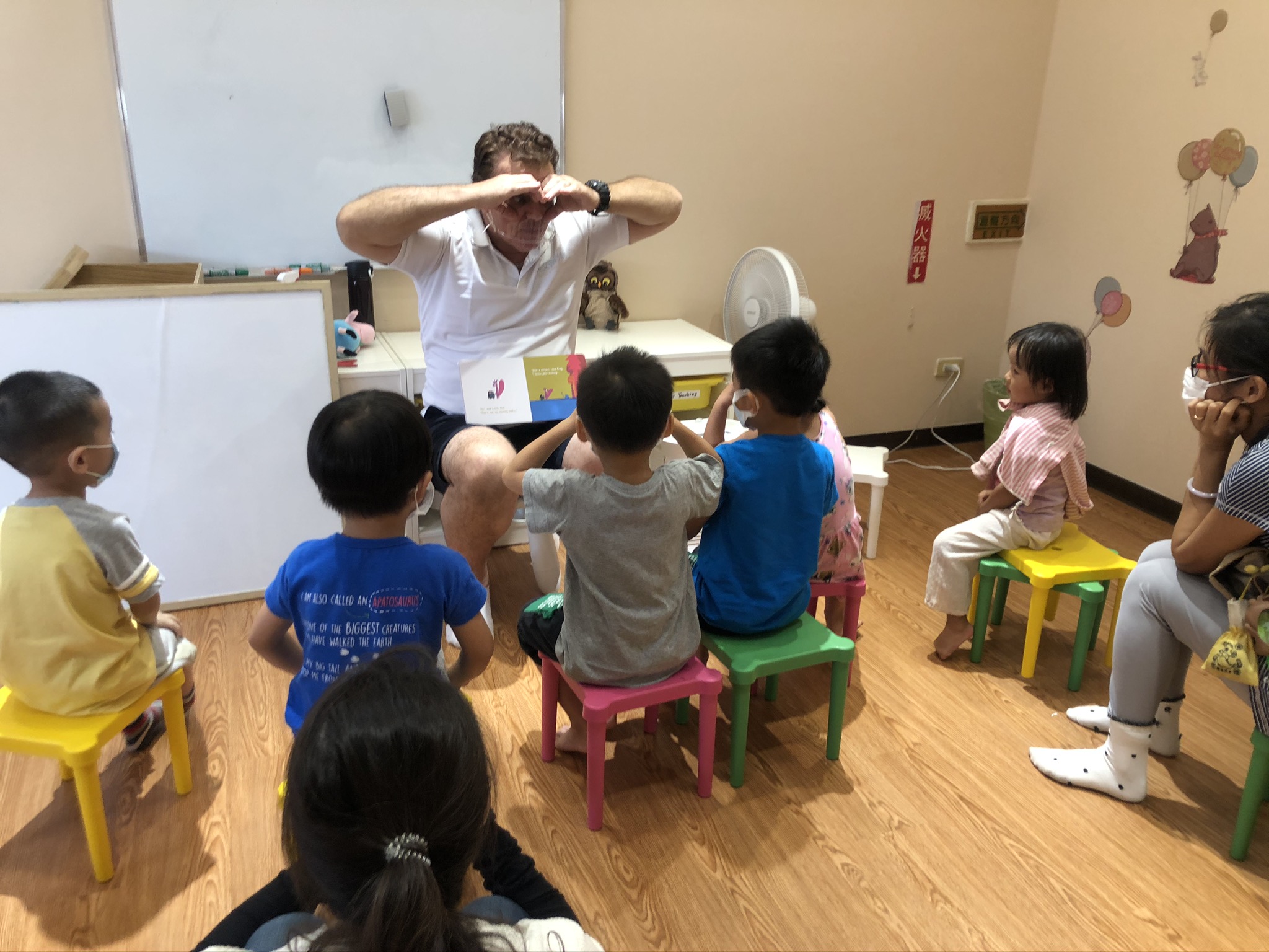 「幼幼聽說英文繪本」平日一個時段會有6~8位,假日則會有8~10位,由Gavin外師和Christine中師或助教帶領。