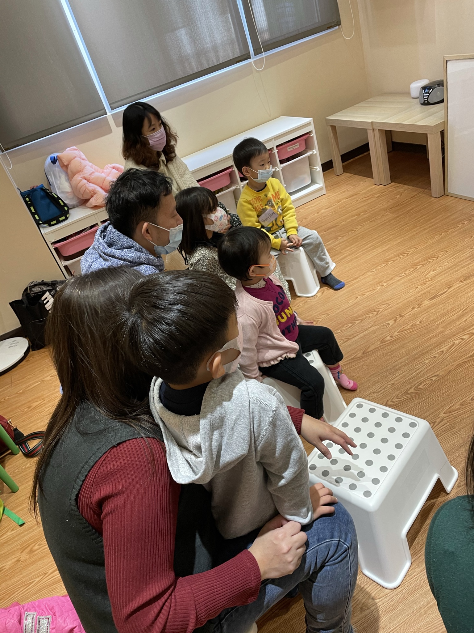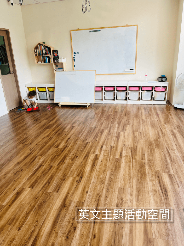 學齡前的幼兒,建議家長陪同,一起適應新環境,有安全感以後,也可以更快融入團體學習。因為場地限制關係,只有一位家長陪同,另一位可以在外面透過玻璃看喔!